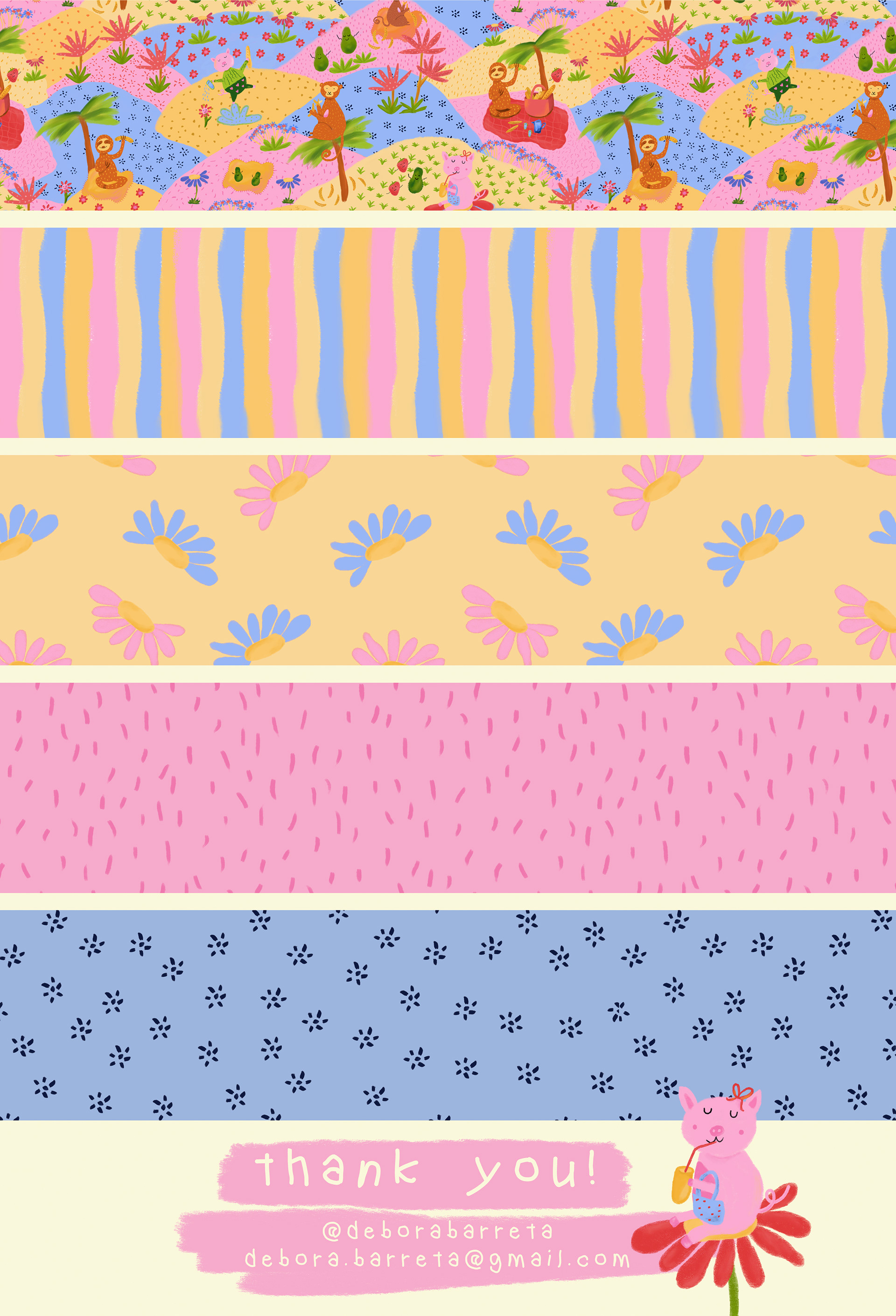 "Picnic in the forest" is a project that combines illustration and pattern design for children. The characters designed for this project were inspired by a fun, happy picnic within a forest. The illustrations are all digital, and the main pattern lead to the whole collection, which can by applied to children clothing as well as decoration for kids.