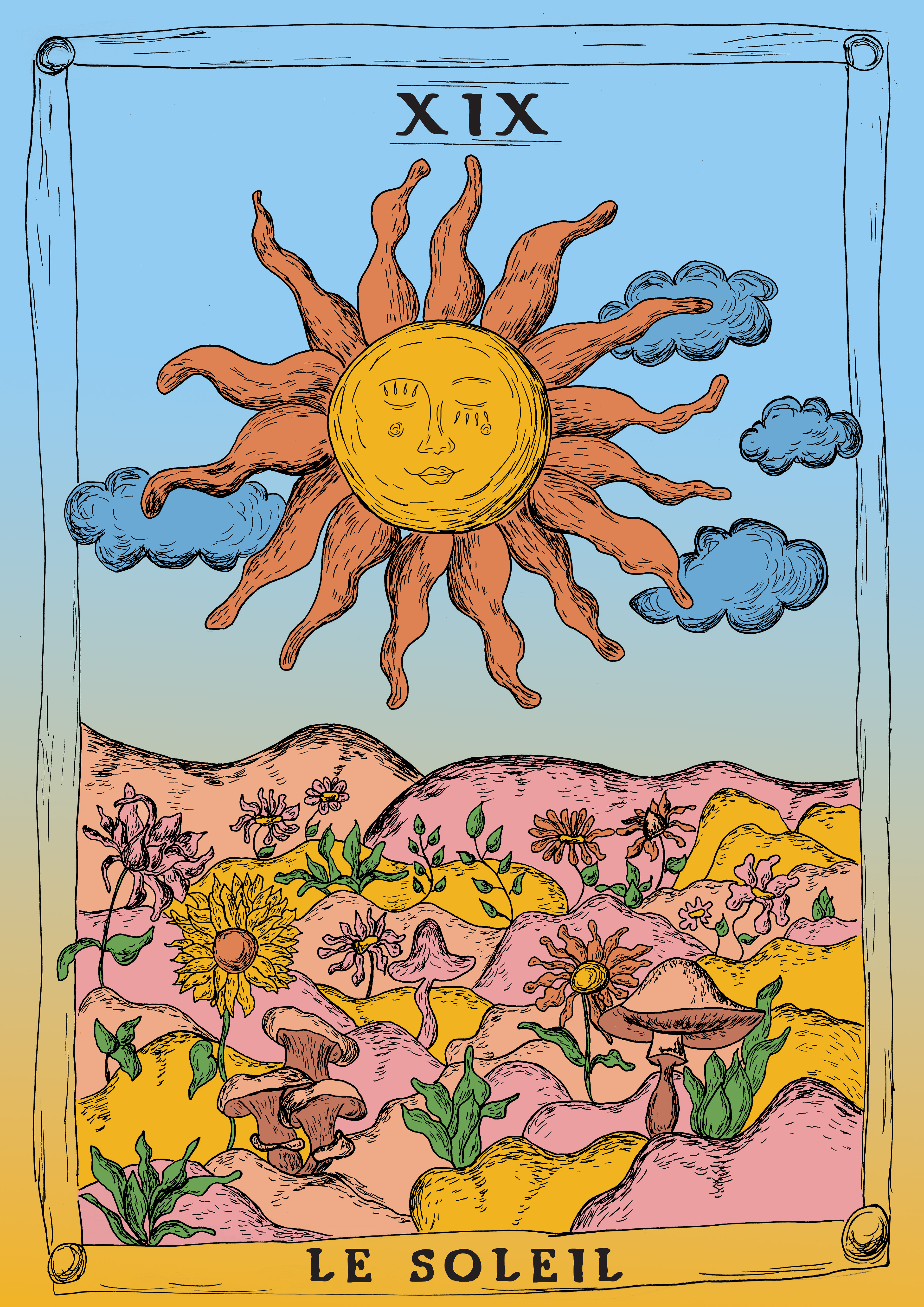 Illustration representing "the sun" tarot card. Created with mixed media: ink and digital painting, in a vintage style.